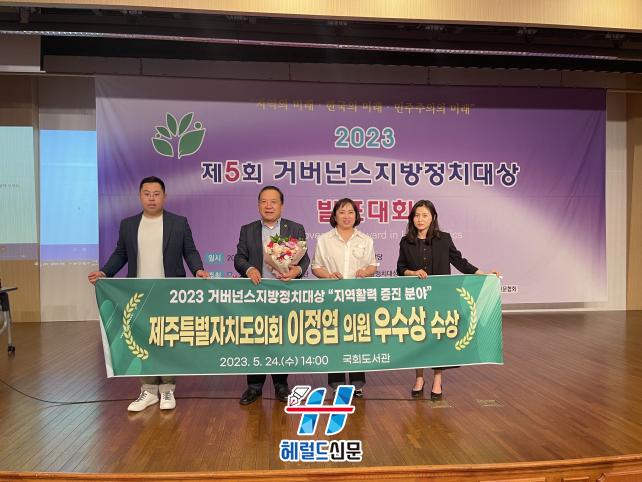 [Çì·²µå½Å¹® = ¹®»óÁØ ±âÀÚ] Á¦ÁÖÆ¯º°ÀÚÄ¡µµÀÇȸ ÇàÁ¤ÀÚÄ¡À§¿øÈ¸ ÀÌÁ¤¿± ÀÇ¿ø(±¹¹ÎÀÇÈû, ¼±ÍÆ÷½Ã ´ë·ûµ¿)Àº »ç)°Å¹ö³Í½º¼¾ÅͰ¡ ÁÖÃÖÇÑ ¡®2023³â °Å¹ö³Í½º Áö¹æÁ¤Ä¡´ë»ó °ø¸ð´ëȸ¡¯¿¡¼ ¡®Áö¿ªÈ°·Â ÁõÁø ºÐ¾ß¡¯ ¿ì¼ö»óÀ» ¼ö»óÇß´Ù.