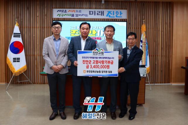 [Çì·²µå½Å¹® = ÃÖÁ¾¼ö ±âÀÚ] Áø¾È±ºÀº ¹«ÁøÀåÃà»ê³óÇù(Á¶ÇÕÀå ¼ÛÁ¦±Ù)ÀÌ Áö³ 26ÀÏ Áø¾È±º °íÇâ»ç¶û ±âºÎÀÇ ³¯À» ¿î¿µÇÏ°í ±âºÎ±Ý 340¸¸¿øÀ» ¸ð±ÝÇØ Àü´ÞÇß´Ù°í ¹àÇû´Ù.
