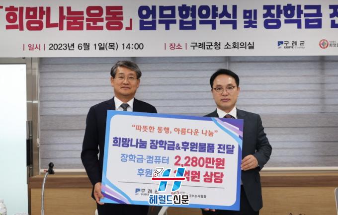 [Çì·²µå½Å¹® = ÃÖÁ¾¼ö ±âÀÚ] ±¸·Ê±ºÀº Áö³ 1ÀÏ ±ºÃ» ¼ÒȸÀǽǿ¡¼ (»ç)Èñ¸ÁÀ»³ª´©´Â»ç¶÷µé(ȸÀå ±èÁ¤¾È)°ú ¡®Èñ¸Á ³ª´® ¿îµ¿¡¯ ¾÷¹«Çù¾à ¹× ÀåÇÐ±Ý Àü´Þ½ÄÀ» °¡Á³´Ù°í ¹àÇû´Ù.