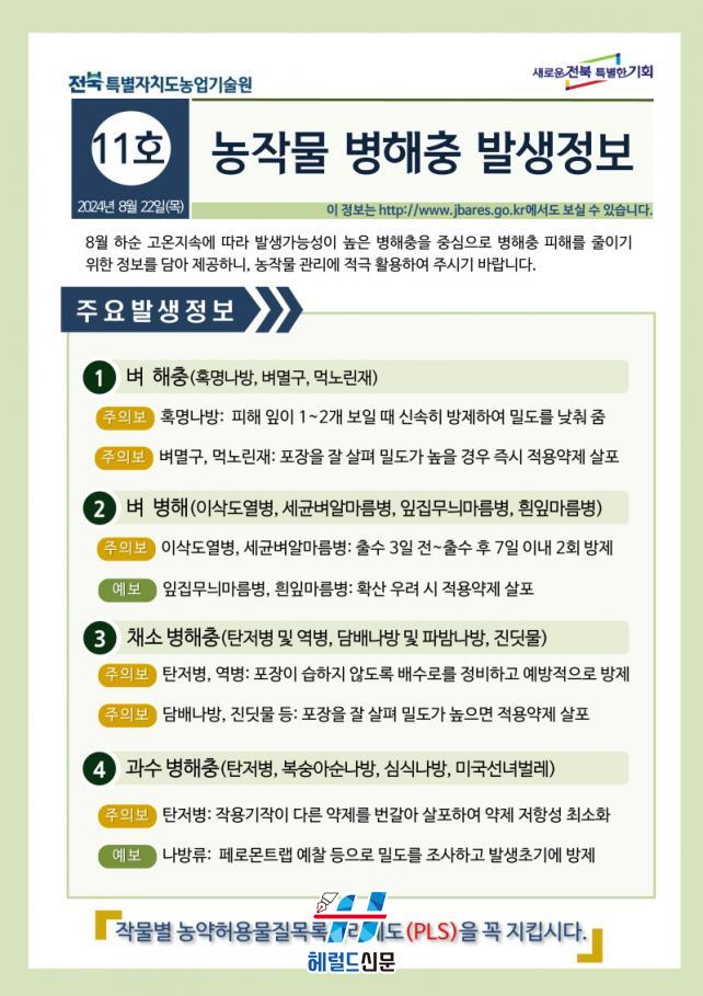 [Çì·²µå½Å¹® = ¹®»óÁØ ±âÀÚ] ÀüºÏƯº°ÀÚÄ¡µµ³ó¾÷±â¼ú¿ø(¿øÀå ÃÖÁØ¿)¿¡¼´Â 8¿ù ¸»±îÁö Áö¼ÓµÉ °ÍÀ¸·Î ¿¹»óµÇ´Â °í¿Â¿¡ ´ëºñÇØ º Ȥ¸í³ª¹æ°ú ä¼Ò·ù źÀúº´ µî ÁÖ¿ä º´ÇØÃæ¿¡ ´ëÇÑ Áø´Ü ¹× ¹æÁ¦±â¼ú Á¤º¸¸¦ ¹ßÇ¥Çϰí, ³ó°¡¿¡ Àû±â¹æÁ¦¸¦ ´çºÎÇß´Ù.
