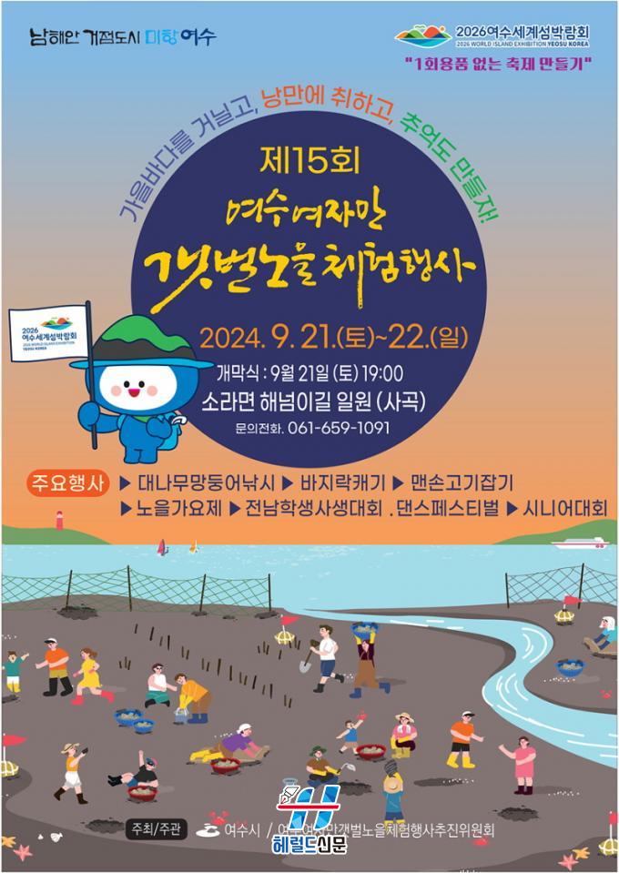 13ÀÏ ¿©¼ö½Ã(½ÃÀå Á¤±â¸í)¿¡ µû¸£¸é ¿ÃÇØ Çà»ç´Â ¹«»ç ¾È³ç°ú dz¾î¸¦ ºñ´Â ¡®´ç»êÁ¦¡¤Ç³¾îÁ¦¡¯¸¦ ½ÃÀÛÀ¸·Î À̰÷¿¡¼¸¸ Áñ±æ ¼ö ÀÖ´Â ¡®´ë³ª¹« ¸ÁµÕ¾î ³¬½Ã¡¯, ¡®¸Ç¼Õ°í±âÀâÀÌ Ã¼Ç衯, ¡®¹ÙÁö¶ô ij±â üÇ衯, ¡®°¡Á· ¸í¶û¿îµ¿È¸¡¯ µî ´Ùä·Î¿î üÇèÇà»ç°¡ ÁøÇàµÈ´Ù.