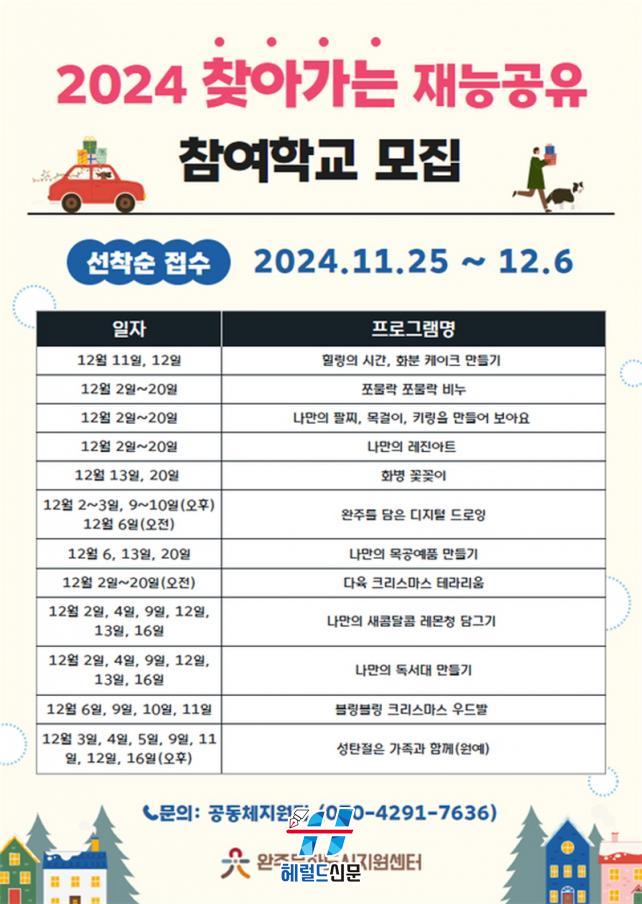 [Çì·²µå½Å¹® = ¹®»óÁØ ±âÀÚ] ¿ÏÁÖ¹®Èµµ½ÃÁö¿ø¼¾ÅÍ(¼¾ÅÍÀå Á¶Áظð)¿¡¼´Â °ü³» ÃʵîÇб³¸¦ ´ë»óÀ¸·Î ¡®2024 ã¾Æ°¡´Â Àç´É°øÀ¯Å¬·´¡¯ Âü¿©Çб³¸¦ 11¿ù 25ÀϺÎÅÍ 12¿ù 6ÀϱîÁö ¼±Âø¼øÀ¸·Î ¸ðÁýÇÑ´Ù.