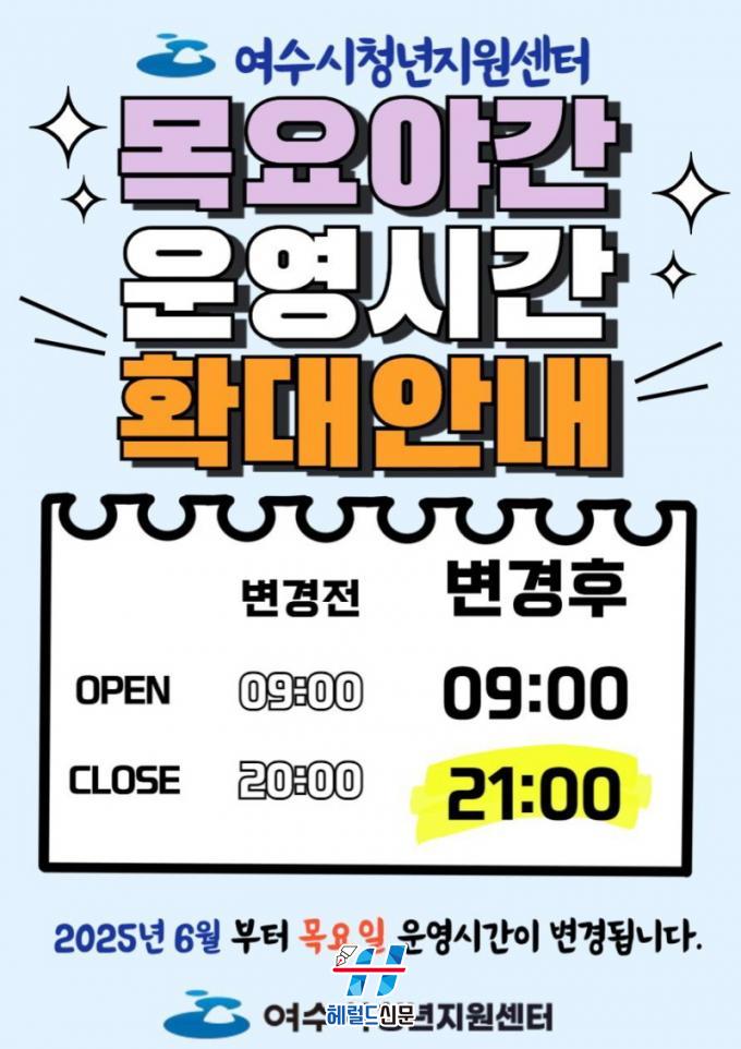 [Çì·²µå½Å¹® = ¹®»óÁØ ±âÀÚ] ¿©¼ö½Ã(½ÃÀå Á¤±â¸í)´Â 6¿ùºÎÅÍ Ã»³âÁö¿ø¼¾ÅÍ ¡®¸ñ¿ä ¾ß°£ ¿î¿µ¡¯À» ¿ÀÈÄ 9½Ã±îÁö 1½Ã°£ ¿¬ÀåÇÑ´Ù°í ¹àÇû´Ù.