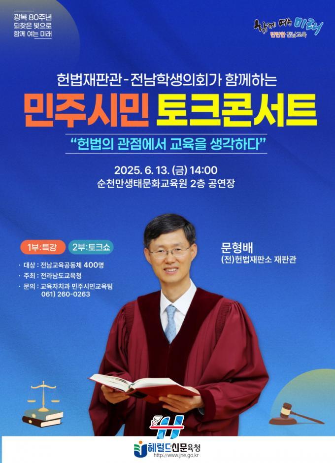 [Çì·²µå½Å¹® = ¹®»óÁØ ±âÀÚ] Àü¶ó³²µµ±³À°Ã»(±³À°°¨ ±è´ëÁß)Àº 13ÀÏ ¿ÀÈÄ 2½Ã ¼øÃµ¸¸»ýŹ®È±³À°¿ø¿¡¼ ¹®Çü¹è Àü Çå¹ýÀçÆÇ¼Ò ÀçÆÇ°üÀ» ÃÊÃ»ÇØ, ¡®Çå¹ýÀçÆÇ°ü-Àü³²ÇлýÀÇȸ¿Í ÇÔ²²ÇÏ´Â ¹ÎÁֽùΠÅäÅ© ÄܼƮ¡¯¸¦ °³ÃÖÇÑ´Ù.