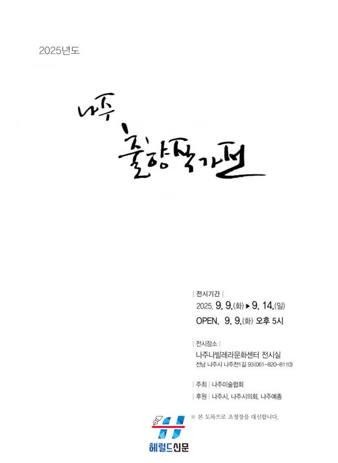 [Çì·²µå½Å¹® = ³ë½Â¾ð ±âÀÚ] ³ªÁÖ½Ã(½ÃÀå À±º´ÅÂ)°¡ Áö¿ª ¹®È¿¹¼ú ¹ßÀü°ú ÀÛ°¡µéÀÇ ±³·ù¸¦ À§ÇØ ¸¶·ÃÇÑ ¡®2025 ÃâÇâÀÛ°¡ÃÊ´ëÀü¡¯ÀÌ 9ÀÏ(È)ºÎÅÍ 14ÀÏ(¸ñ)±îÁö 6Àϰ£ ³ªÁÖ³ªºô·¹¶ó¹®È¼¾ÅÍ Àü½Ã½Ç¿¡¼ ¿¸°´Ù.