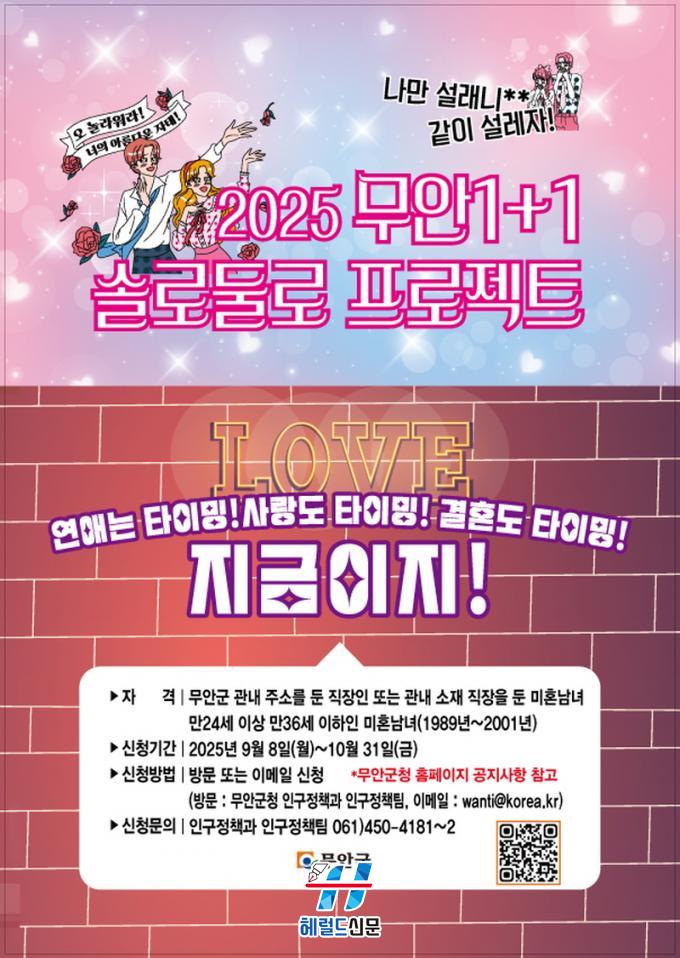 À̹ø ¼Ö·ÎµÑ·Î ÇÁ·ÎÁ§Æ® Âü°¡ ´ë»óÀº ¹«¾È±º °ÅÁÖ Á÷ÀåÀÎ ¶Ç´Â ±º³» Á÷ÀåÀ» µÐ ¹ÌÈ¥³²³à(1989~2001³â»ý, ¸¸ 24~36¼¼)À̸ç, ½ÅûÀº 2025³â 9¿ù 8ÀϺÎÅÍ 10¿ù 31ÀϱîÁö, ¹æ¹® ¶Ç´Â À̸ÞÀÏ(wanti@korea.kr)·Î ½ÅûÇÒ ¼ö ÀÖ´Ù. ÀÚ¼¼ÇÑ »çÇ×Àº ¹«¾È±ºÃ» ȨÆäÀÌÁö °øÁö»çÇ× ¶Ç´Â ¹«¾È±º Àα¸Á¤Ã¥°ú Àα¸Á¤Ã¥ÆÀ(¢Ï 061-450-4181)¿¡¼ È®ÀÎÇÒ ¼ö ÀÖ´Ù.