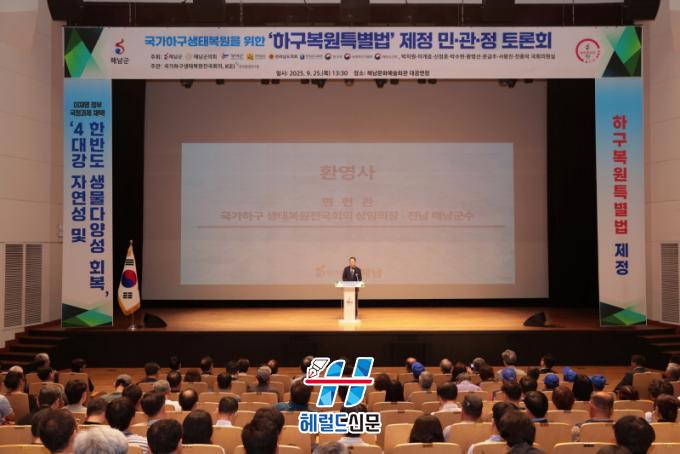 ¸íÇö°ü ÇØ³²±º¼ö´Â ȯ¿µ»ç¿¡¼¡°¿À´Ã Åä·Ðȸ´Â ±¹È¸¿Í Áß¾Ó‧Áö¹æÁ¤ºÎ, Çаè¿Í ¿¬±¸±â°ü, ½Ã¹Î»çȸ µî ¹Î‧°ü‧Á¤ÀÌ ÇÔ²² ±¹°¡Çϱ¸ »ýź¹¿øÀ» ÅëÇØ ȯ°æ°ú ³ó‧¾î¾÷À» »ì¸®°í, Áö¿ª ±ÕÇü¼ºÀåÀÇ °è±â¸¦ ¸¶·ÃÇÏ´Â ÀüȯÁ¡ÀÌ µÉ °ÍÀ̶ó È®½ÅÇÑ´Ù¡±¸é¼¡°´ëÇѹα¹ÀÇ ³ó¾îÃÌ ¼öµµ ÇØ³²±ºµµ Çϱ¸º¹¿øÆ¯º° Á¦Á¤¿¡ ÃÖ¼±À» ´ÙÇϰڴ١±°í ¹àÇû´Ù.