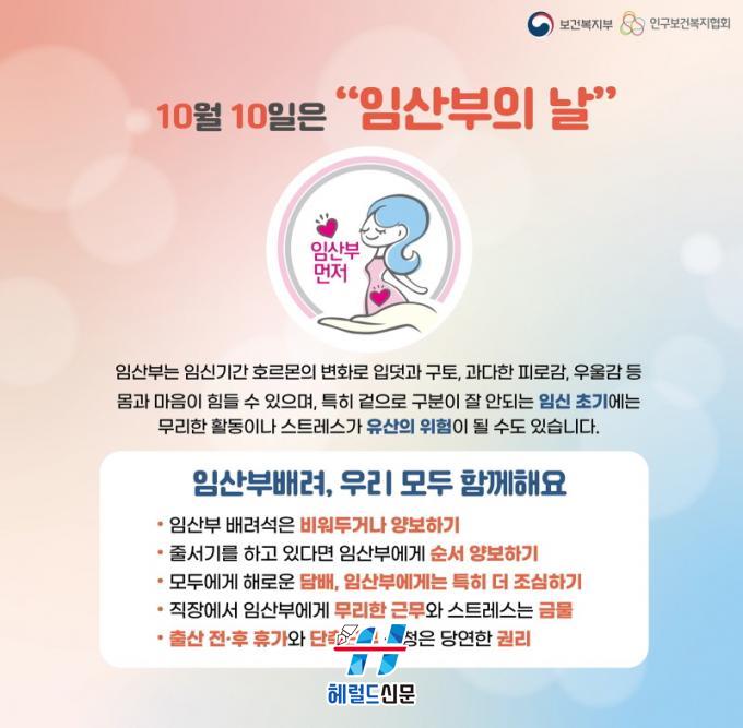 ¿ÃÇØ·Î Á¦20ȸ¸¦ ¸Â´Â ÀÓ»êºÎÀÇ ³¯Àº ¡®¸ðÀÚº¸°Ç¹ý¡¯¿¡ µû¶ó Á¦Á¤µÈ ¹ýÁ¤ ±â³äÀϷΠdz¿ä¿Í ¼öÈ®À» »ó¡ÇÏ´Â 10¿ù°ú ÀӽűⰣ 10°³¿ùÀ» ÀǹÌÇÏ´Â 10¿ù 10ÀÏÀÌ´Ù. ÀÓ»êºÎÀÇ ³¯Àº ÀӽŰú Ãâ»êÀÌ »çȸÀûÀ¸·Î Á¸Áß¹Þ°í ¾çÀ°ÀÇ ¾î·Á¿òÀ» ÇÔ²² ÇØ°áÇØ¾ß ÇÑ´Ù´Â »çȸÀû ¸Þ½ÃÁö¸¦ ´ã°í ÀÖ´Ù.