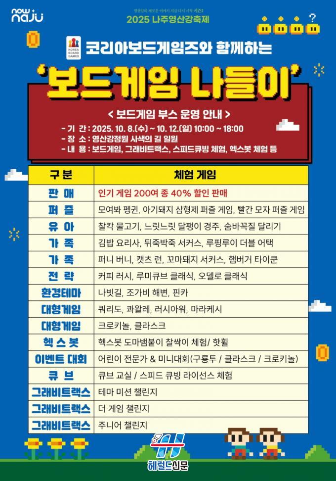 [Çì·²µå½Å¹® = ³ë½Â¾ð ±âÀÚ] ³ªÁֽð¡ ¿À´Â 10¿ù 8ÀϺÎÅÍ 12ÀϱîÁö ¿¸®´Â ¡®2025 ³ªÁÖ¿µ»ê°ÃàÁ¦¡¯¿¡¼ ³²³à³ë¼Ò ´©±¸³ª Áñ±æ ¼ö ÀÖ´Â ¡®º¸µå°ÔÀÓ ³ªµéÀÌ¡¯¸¦ ¿î¿µÇÑ´Ù.