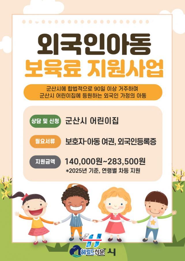[Çì·²µå½Å¹® = ³ë½Â¾ð ±âÀÚ] ±º»ê½Ã°¡ 10¿ùºÎÅÍ °ü³» ¾î¸°ÀÌÁý¿¡ ´Ù´Ï´Â ¿Ü±¹ÀÎ ¾Æµ¿(0~5¼¼)À» ´ë»óÀ¸·Î º¸À°·á ÀϺθ¦ Áö¿øÇÏ´Â ¡®¿Ü±¹ÀÎ ¾Æµ¿ º¸À°·á Áö¿ø»ç¾÷¡¯À» ½ÃÇàÇÑ´Ù.