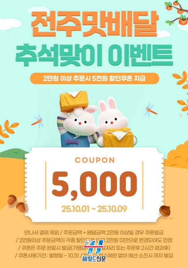 ÀüÁֽà °ø°ø¹è´Þ¾Û ¡®ÀüÁÖ¸À¹è´Þ¡¯, 10¿ù Ȳ±Ý¿¬ÈÞ ±â°£ 2¸¸ ¿ø ÀÌ»ó ÁÖ¹® ½Ã 5000¿ø ÄíÆù Áö±Þ