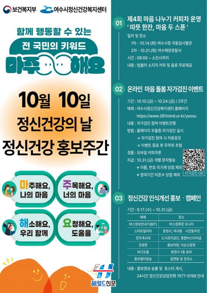 [Çì·²µå½Å¹® = ³ë½Â¾ð ±âÀÚ] ¿©¼ö½Ã(½ÃÀå Á¤±â¸í)´Â Á¤½Å°Ç°ÀÇ ³¯(10¿ù 10ÀÏ)À» ±â³äÇØ 10¿ù 10ÀϺÎÅÍ 24ÀϱîÁö ¡®2025³â Á¤½Å°Ç° È«º¸ÁÖ°£¡¯À» ¿î¿µÇÑ´Ù.