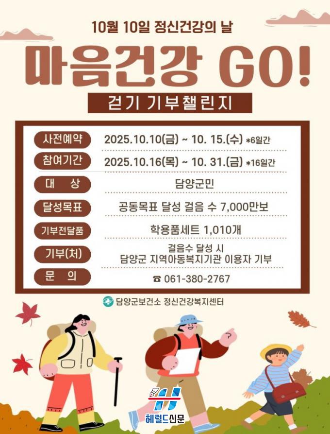 ¡®¸¶À½°Ç° °í(GO)! °È±â ±âºÎ縰Áö¡¯´Â ±º¹ÎÀÌ Àϻ󿡼 °È±â¸¦ ½ÇõÇϸç Á¤½Å°Ç° ÁõÁø°ú ³ª´®À» µ¿½Ã¿¡ ½ÇÇöÇÏ´Â Çà»ç´Ù. 10¿ù 16ÀϺÎÅÍ 31ÀϱîÁö 16Àϰ£ 7õ¸¸ º¸ÀÇ °øµ¿°ÉÀ½À» ¸ñÇ¥·Î ÁøÇàÇÑ´Ù.
