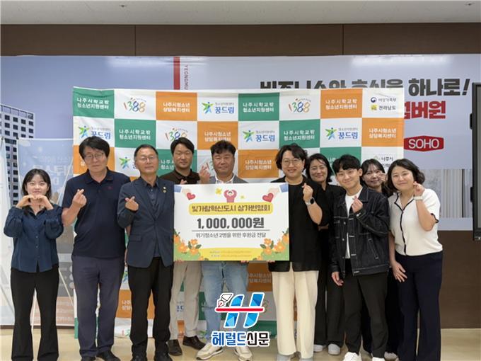 [Çì·²µå½Å¹® = ³ë½Â¾ð ±âÀÚ] ºû°¡¶÷Çõ½Åµµ½Ã »ó°¡¹ø¿µÈ¸°¡ Áö¿ª»çȸ ³» À§±âû¼Ò³âÀ» À§ÇÑ µû¶æÇÑ ³ª´®¿¡ ¾ÕÀå¼¹´Ù. »ó°¡¹ø¿µÈ¸´Â Áö³ 10¿ù 1ÀÏ, ³ªÁÖ½Ãû¼Ò³â»ó´ãº¹Áö¼¾ÅͳªÁÖ½ÃÇб³¹Ûû¼Ò³âÁö¿ø¼¾ÅÍ¿ÍÀÇ ¸¸³²À» ÅëÇØ À§±âû¼Ò³â 2¸íÀ» À§ÇÑ ÈÄ¿ø±Ý 1,000,000¿øÀ» Àü´ÞÇß´Ù.