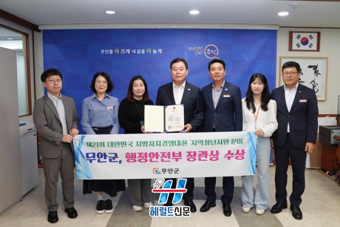 [Çì·²µå½Å¹® = Àü¿µ±Ô ±âÀÚ] ¹«¾È±º(±º¼ö ±è»ê)Àº ÇàÁ¤¾ÈÀüºÎ¿Í Çѱ¹ÀϺ¸°¡ °øµ¿À¸·Î ÁÖÃÖÇÑ ¡¸Á¦21ȸ ´ëÇѹα¹ Áö¹æÀÚÄ¡°æ¿µ´ëÀü¡¹¿¡¼ Áö¿ªÃ»³â Áö¿ø ºÐ¾ß ¿ì¼ö±â°üÀ¸·Î ¼±Á¤µÇ¾î ÇàÁ¤¾ÈÀüºÎ Àå°ü ǥâÀ» ¼ö»óÇß´Ù.