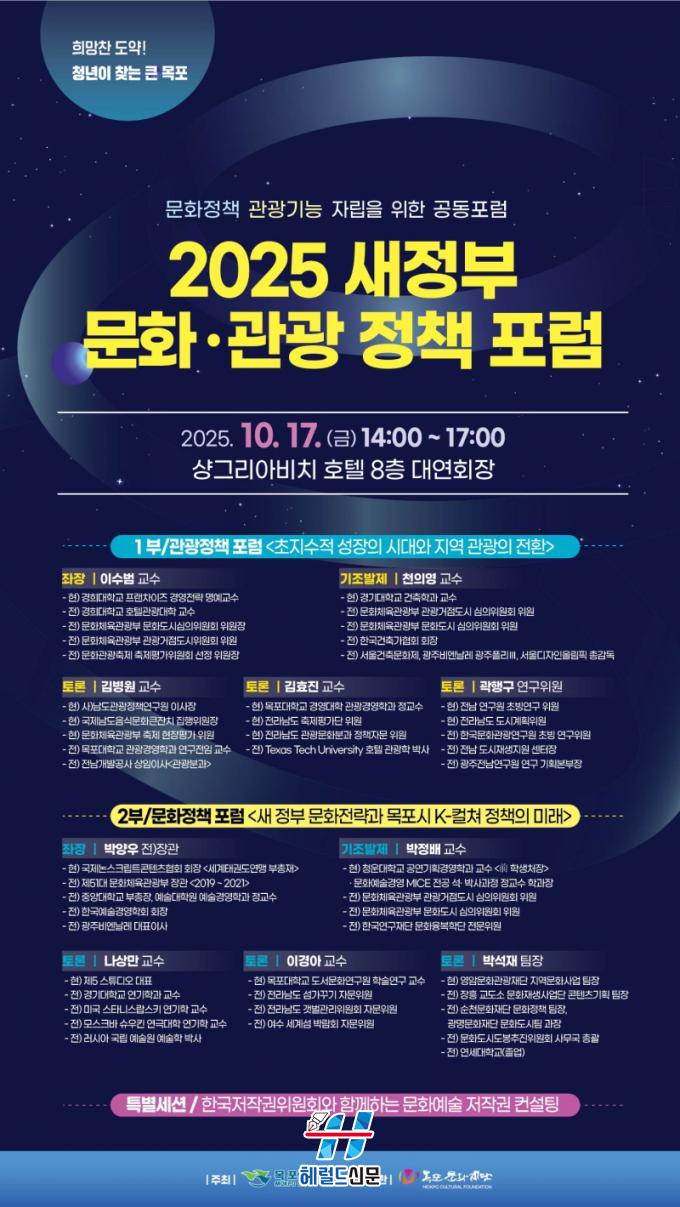 1ºÎ °ü±¤Æ÷·³Àº ¡®ÃÊÁö¼öÀû ¼ºÀåÀÇ ½Ã´ë¿Í Áö¿ª °ü±¤ÀÇ Àüȯ¡¯, 2ºÎ ¹®ÈÆ÷·³Àº ¡®»õÁ¤ºÎÀÇ ¹®ÈÀü·«°ú ¸ñÆ÷½Ã K-ÄÃó Á¤Ã¥ÀÇ ¹Ì·¡¡¯¸¦ ÁÖÁ¦·Î ÁøÇàµÈ´Ù. ¹Ú¾ç¿ì Àü ¹®ÈüÀ°°ü±¤ºÎ Àå°üÀ» ºñ·ÔÇØ ¹®È¡¤°ü±¤ ºÐ¾ßÀÇ Àü¹® ±³¼öµéÀÌ ÁÂÀå°ú ±âÁ¶¹ßÁ¦¸¦ ¸ÃÀ¸¸ç, °¢ ¼¼¼Ç ÁÖÁ¦¹ßÇ¥ ÈÄ¿¡´Â Áö¿ª ±³¼ö ¹× Àü¹®°¡µéÀÌ Âü¿©ÇÏ´Â ½ÉÃþ Åä·ÐÀÌ À̾îÁú ¿¹Á¤ÀÌ´Ù.
