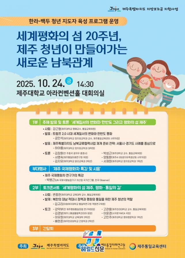 Á¦ÁÖµµ°¡ ÁÖÃÖÇϰí Á¦ÁÖÅëÀϹ̷¡¿¬±¸¿ø(¿øÀå °í¼ºÁØ)°ú Á¦ÁÖÅëÀϱ³À°¼¾ÅÍ(¼¾ÅÍÀå ±èÀÏȯ)°¡ ÁÖ°üÇÏ´Â À̹ø Çà»ç´Â ¡®Á¦ÁÖ Ã»³âÀÌ ¸¸µé¾î°¡´Â »õ·Î¿î ³²ºÏ °ü°è¡¯¸¦ ÁÖÁ¦·Î, °æ»öµÈ ³²ºÏ°ü°è ¼Ó¿¡¼µµ ÇѹݵµÀÇ ÆòÈ¿Í ÅëÀÏ ºñÀüÀ» ¸ð»öÇÏ´Â ÀÚ¸®·Î ¸¶·ÃµÆ´Ù.