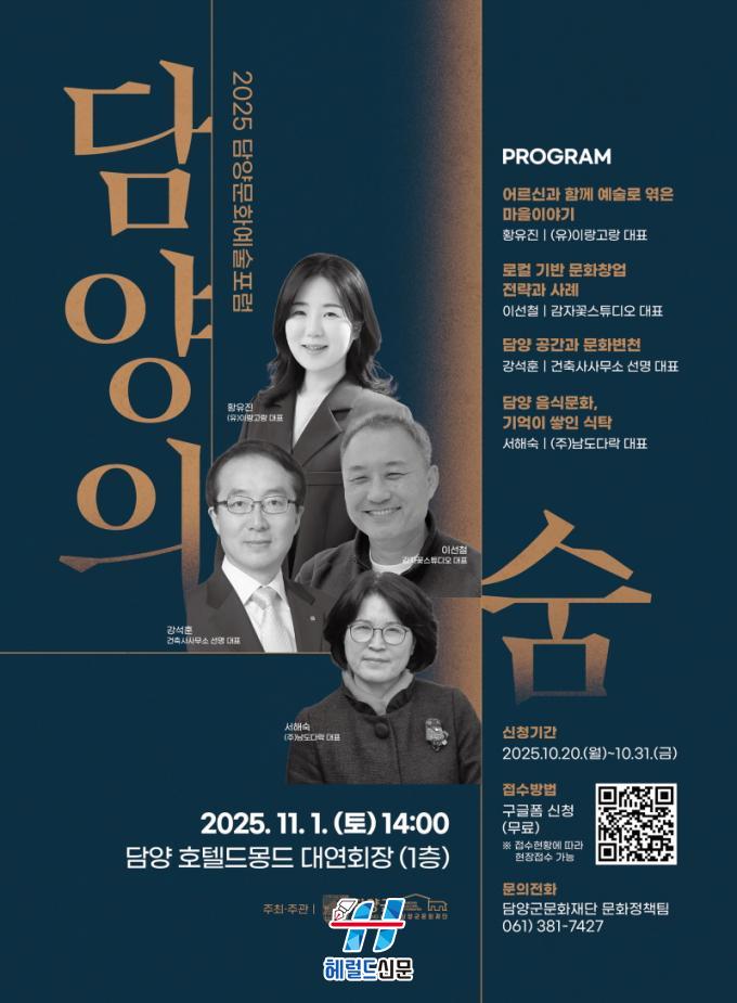 [Çì·²µå½Å¹® = Àü¿µ±Ô ±âÀÚ] ´ã¾ç±º¹®ÈÀç´Ü(ÀÌ»çÀå Á¤Ã¶¿ø, ÀÌÇÏ Àç´Ü)Àº 11¿ù 1ÀÏ Åä¿äÀÏ ¿ÀÈÄ 2½Ã, ´ã¾ç È£ÅÚµå¸ùµå ´ë¿¬È¸Àå¿¡¼ 2025 ´ã¾ç ¹®È¿¹¼úÆ÷·³ ¡¸´ã¾çÀÇ ¼û¡¹À» °³ÃÖÇÑ´Ù°í ¹àÇû´Ù.