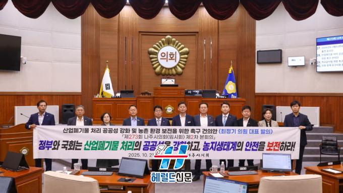 [Çì·²µå½Å¹® = ³ë½Â¾ð ±âÀÚ] ³ªÁÖ½ÃÀÇȸ(ÀÇÀå ÀÌÀç³²)´Â 21ÀÏ Á¦273ȸ ÀÓ½Ãȸ Á¦2Â÷ º»È¸ÀǸ¦ ¿°í ¡®»ê¾÷Æó±â¹° ó¸® °ø°ø¼º °È ¹× ³óÃÌ È¯°æ º¸ÀüÀ» À§ÇÑ Ã˱¸ °ÇÀǾȡ¯À» äÅÃÇß´Ù.