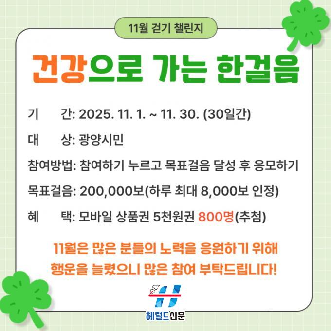 [Çì·²µå½Å¹® = ³ë½Â¾ð ±âÀÚ] ±¤¾ç½Ã´Â Áö¿ª ÁÖ¹ÎÀÇ °Ç°»ýȰ ½ÇõÀ» µ½±â À§ÇØ 11¿ù 1ÀϺÎÅÍ 30ÀϱîÁö ¸ð¹ÙÀÏ °È±â ¾Û ¡¸¿öÅ©¿Â¡¹¿¡¼ ¡®°Ç°À¸·Î °¡´Â ÇѰÉÀ½ 11¿ù °È±â 縰Áö¡¯¸¦ ¿î¿µÇÑ´Ù°í ¹àÇû´Ù.