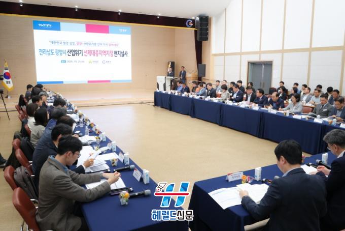 [Çì·²µå½Å¹® = ³ë½Â¾ð ±âÀÚ] ±¤¾ç½Ã(½ÃÀå Á¤ÀÎÈ)´Â 10¿ù 21ÀÏ ¡®»ê¾÷À§±â ¼±Á¦´ëÀÀÁö¿ª ÁöÁ¤¡¯ ÇöÁö ½Ç»ç¸¦ À§ÇØ ½Ã¸¦ ¹æ¹®ÇÑ À§¿øµé¿¡°Ô ö°»ê¾÷ÀÇ ±¸Á¶Àû À§±â »óȲÀ» ¼³¸íÇϰí, Á¤ºÎÀÇ Àû±ØÀûÀÎ Áö¿ø°ú Á¶¼ÓÇÑ ÁöÁ¤À» °·ÂÈ÷ ¿äûÇß´Ù°í ¹àÇû´Ù.