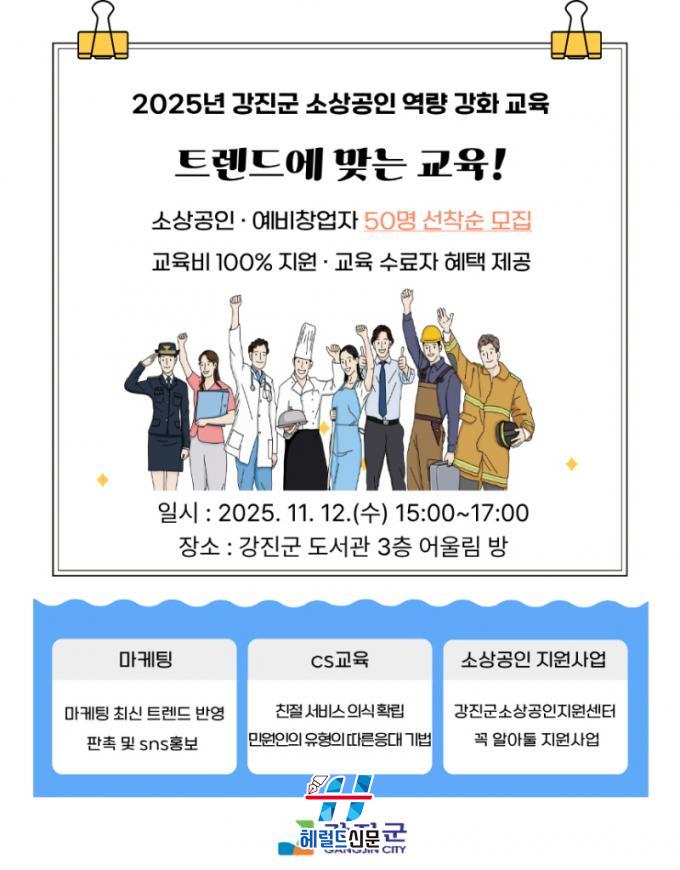 [Çì·²µå½Å¹® = Àü¿µ±Ô ±âÀÚ] °Áø±ºÀÌ °ü³» ¼Ò»ó°øÀΰú ¿¹ºñâ¾÷ÀÚ¸¦ ´ë»óÀ¸·Î ¸ÅÃâ Áõ´ë¸¦ À§ÇÑ ½ÇÀü Áß½ÉÀÇ ±³À°À» ¿î¿µÇÑ´Ù. ±³À° ½ÅûÀº ¿À´Â 11¿ù 7ÀϱîÁö ÁøÇàµÇ¸ç, ±³À°Àº 11¿ù 12ÀÏ ¼ö¿äÀÏ ¿ÀÈÄ 3½ÃºÎÅÍ 5½Ã±îÁö °Áø±º µµ¼°ü 3Ãþ¿¡¼ ½Ç½ÃµÉ ¿¹Á¤ÀÌ´Ù.