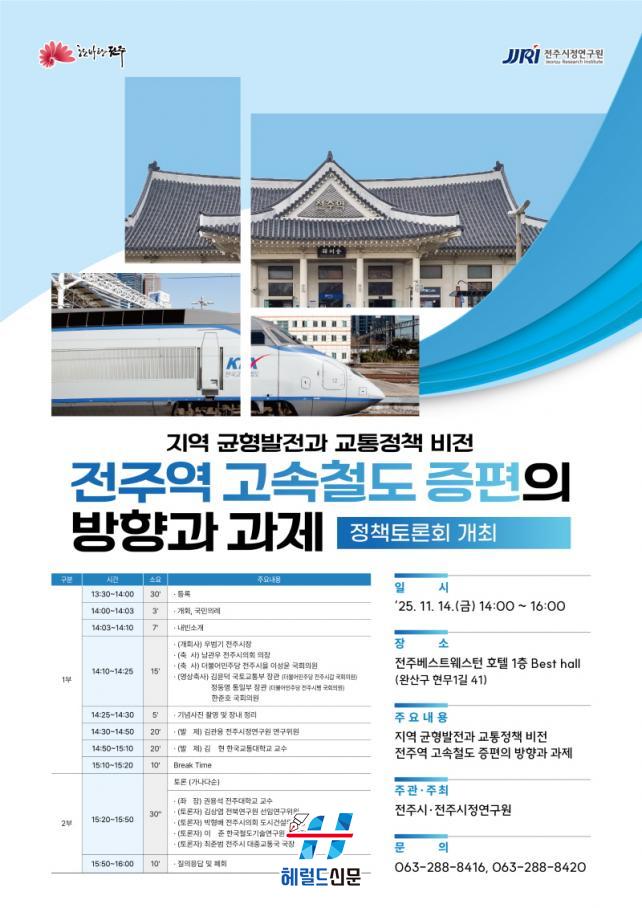 ÀüÁÖ½Ã¿Í ÀüÁÖ½ÃÁ¤¿¬±¸¿øÀº ¿À´Â 11¿ù 14ÀÏ ¿ÀÈÄ 2½Ã, º£½ºÆ®¿þ½ºÅÏÇ÷¯½º ÀüÁÖÈ£ÅÚ 1Ãþ º£½ºÆ®È¦(¿Ï»ê±¸ Çö¹«1±æ 41)¿¡¼ ¡®Áö¿ª ±ÕÇü¹ßÀü°ú ±³ÅëÁ¤Ã¥ ºñÀü-ÀüÁÖ¿ª °í¼Óöµµ ÁõÆí ¹æÇâ°ú °úÁ¦¡¯¸¦ ÁÖÁ¦·Î Á¤Ã¥Åä·Ðȸ¸¦ °³ÃÖÇÑ´Ù.