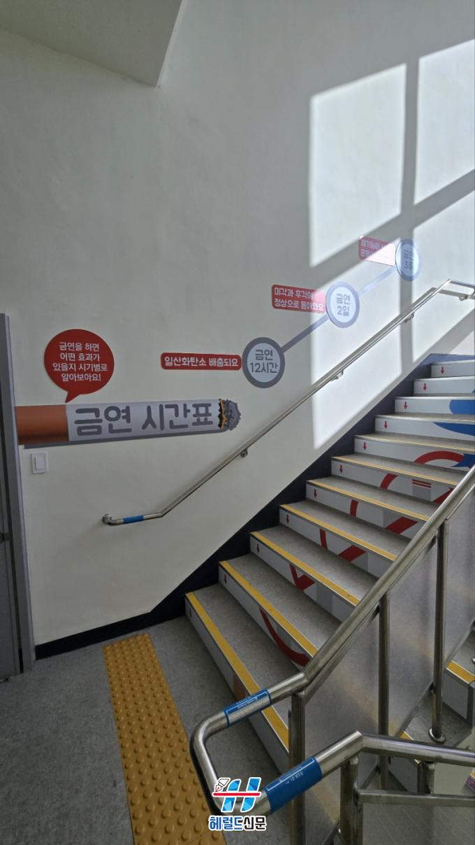 Çб³ ÁÖ¿ä °Ç¹° ³»ºÎ °è´Ü¿¡ ¼³Ä¡µÈ °Ç°°è´ÜÀº ±Ý¿¬¡¤±ÝÁÖ¸¦ ÁÖÁ¦·Î ÇÑ ¹®±¸¿Í À̹ÌÁö°¡ ºÎÂøµÇ¾î ÇлýµéÀÌ ÀÚ¿¬½º·´°Ô °Ç° ¸Þ½ÃÁö¸¦ Á¢ÇÒ ¼ö ÀÖµµ·Ï ¸¸µé¾ú´Ù.