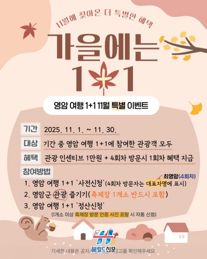 ¿µ¾Ï±º(±º¼ö ¿ì½ÂÈñ)ÀÌ Áö¿ª ÃàÁ¦ °³ÃÖ¿Í ¿¬°èÇØ 11¿ù ÇÑ ´Þ ¡®¿µ¾Ï¿©Çà 1+1 Ưº°À̺¥Æ®¡¯·Î Áö¿ªÈÆó ¿ùÃâÆäÀ̸¦ 1¸¸¿ø Ãß°¡ Áö±ÞÇÑ´Ù.