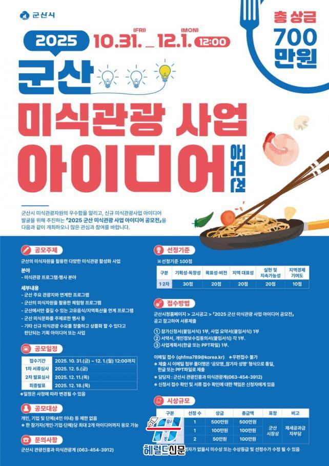 [Çì·²µå½Å¹® = ³ë½Â¾ð ±âÀÚ] ±º»ê½Ã°¡ Áö¿ªÀÇ ¹Ì½ÄÀÚ¿øÀ» Ȱ¿ëÇÑ °ü±¤ Ȱ¼ºÈ¿Í »õ·Î¿î ¹Ì½Ä°ü±¤»ç¾÷ ¾ÆÀ̵ð¾î ¹ß±¼À» À§ÇØ¡¸2025 ±º»ê ¹Ì½Ä°ü±¤ »ç¾÷ ¾ÆÀ̵ð¾î °ø¸ðÀü¡¹À» °³ÃÖÇÑ´Ù.