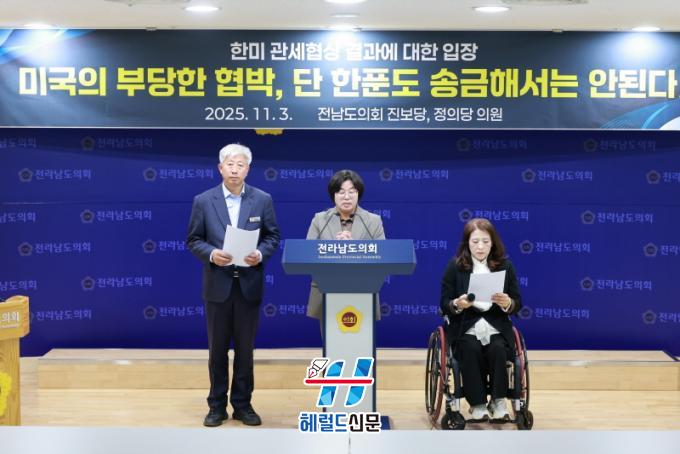 [Çì·²µå½Å¹® = Àü¿µ±Ô ±âÀÚ] Àü¶ó³²µµÀÇȸ ¿À¹ÌÈ ÀÇ¿ø(Áøº¸´ç¡¤¿µ±¤2)À» ºñ·ÔÇÑ Áøº¸´ç¤ýÁ¤ÀÇ´ç ¼Ò¼Ó ÀÇ¿øµéÀº Áö³ 11¿ù 3ÀÏ, Àü³²µµÀÇȸ ºê¸®Çη뿡¼ ±âÀÚȸ°ßÀ» ¿°í, ¡®10¤ý29 ÇÑ¹Ì °ü¼¼ Çù»ó Ÿ°á¡¯¿¡ ´ëÇÑ °øµ¿ ÀÔÀå¹®À» ¹ßÇ¥Çß´Ù.