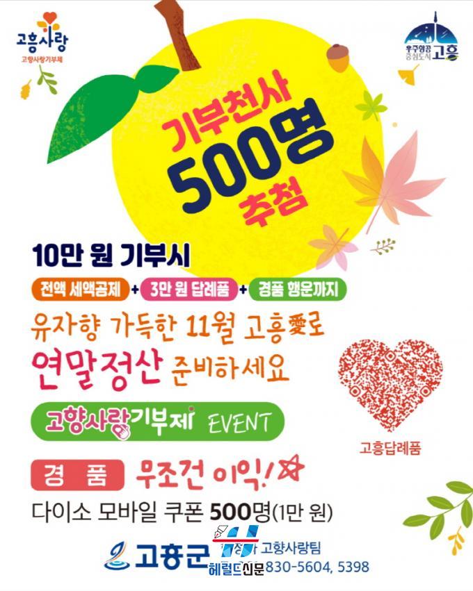 [Çì·²µå½Å¹® = ³ë½Â¾ð ±âÀÚ] °íÈﱺ(±º¼ö °ø¿µ¹Î)Àº À¯ÀÚÇâÀÌ °¡µæÇÑ 11¿ùÀ» ¸Â¾Æ °íÇâ»ç¶û±âºÎÁ¦ Âü¿©ÀÚ¿¡°Ô °¨»çÀÇ ¸¶À½À» ÀüÇϱâ À§ÇØ ¡®°íÈï¾Ö(äñ) ¿¬¸»Á¤»ê À̺¥Æ®¡¯¸¦ 11¿ù 30ÀϱîÁö ¿î¿µÇÑ´Ù°í ¹àÇû´Ù.