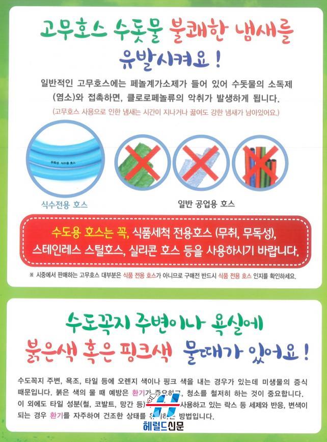 ÀÌ¿¡ ½Ã´Â ¡âÀ½¿ëÀ̳ª Á¶¸®¿ëÀ¸·Î »ç¿ëÇÏ´Â ¼öµµ¿¡´Â °í¹«È£½º ¿¬°áÀ» ÇÇÇÒ °Í ¡âºÎµæÀÌ °í¹«È£½º¸¦ »ç¿ëÇÒ °æ¿ì ¹«Ã롤¹«µ¶¼ºÀÇ ¼öµµ¿ë ½Ä¼öÀü¿ë °í¹«È£½º ¶Ç´Â ½Ç¸®ÄÜ È£½º µîÀ» »ç¿ëÇÒ °Í µîÀ» ´çºÎÇß´Ù. ÀÌ¿Í ÇÔ²² ½Ã´Â ½Ã¹ÎµéÀÇ ¼öµ¾¹° À½¿ë·üÀ» ³ôÀ̱â À§ÇØ ¼öµ¾¹°À» ´õ ¸ÀÀÖ°Ô ¸¶½Ã´Â ¹æ¹ýµµ ÇÔ²² ¾È³»Çß´Ù.