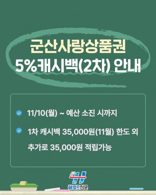 [Çì·²µå½Å¹® = ³ë½Â¾ð ±âÀÚ] ±º»ê½Ã°¡ ÇàÁ¤¾ÈÀüºÎ·ÎºÎÅÍ Áö¿ª»ç¶û»óǰ±Ç ¹ßÇà °ü·Ã Ưº°Áö¿ø ±¹ºñ º¸Á¶±ÝÀ» Ãß°¡·Î ±³ºÎ¹Þ¾Æ Ưº° ij½Ã¹é Àû¸³ ÇýÅÃÀ» Á¦°øÇÑ´Ù.