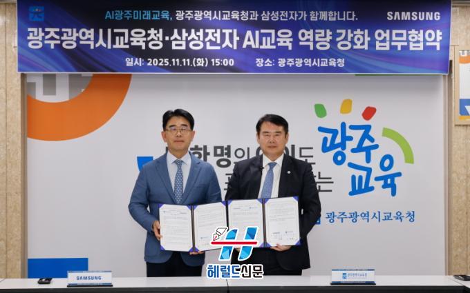 [Çì·²µå½Å¹® = ³ë½Â¾ð ±âÀÚ] ±¤Áֽñ³À°Ã»(±³À°°¨ ÀÌÁ¤¼±)Àº 11ÀÏ º»Ã» »óȲ½Ç¿¡¼ »ï¼ºÀüÀÚ¿Í ÇÔ²² AI±³À°¿ª·® °È¸¦ À§ÇÑ ¾÷¹«Çù¾à(MOU)À» ü°áÇß´Ù.