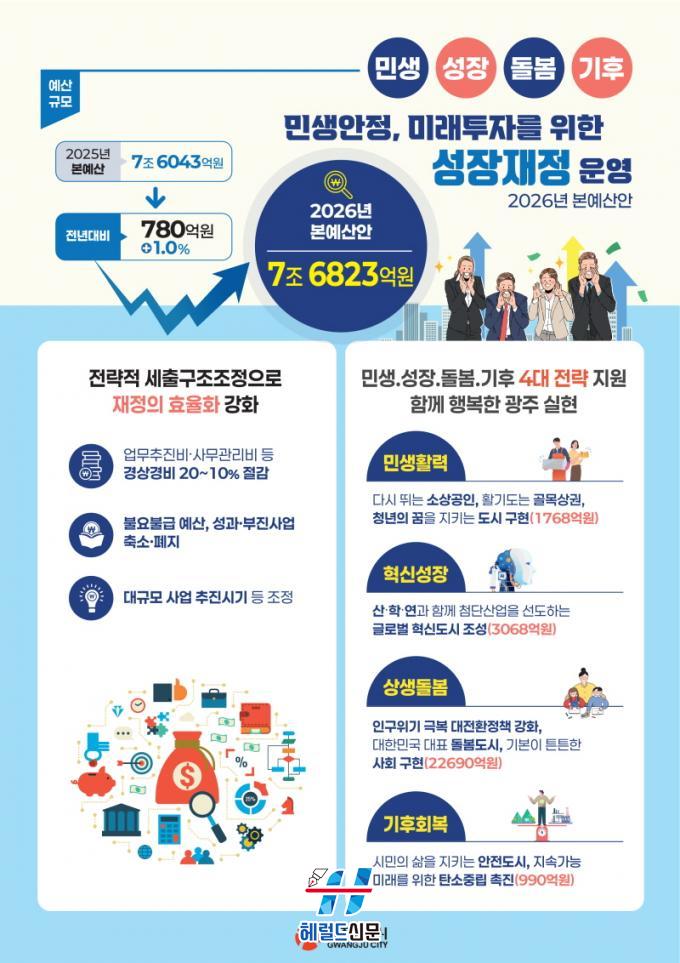 [Çì·²µå½Å¹® = ³ë½Â¾ð ±âÀÚ] ±¤ÁÖ±¤¿ª½Ã(½ÃÀå °±âÁ¤)´Â 2026³âµµ º»¿¹»ê¾ÈÀ» 7Á¶6823¾ï¿ø ±Ô¸ð·Î Æí¼ºÇØ 11ÀÏ ±¤ÁÖ±¤¿ª½ÃÀÇȸ¿¡ Á¦ÃâÇß´Ù.