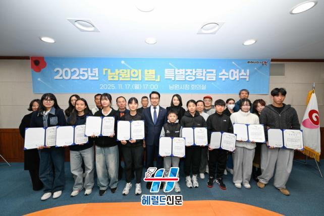 [Çì·²µå½Å¹® = ³ë½Â¾ð ±âÀÚ] ÃáÇâÀåÇÐÀç´Ü(ÀÌ»çÀå ÃÖ°æ½Ä)Àº 11¿ù 17ÀÏ ³²¿ø½Ãû ȸÀǽǿ¡¼ ¡°2025³â ³²¿øÀÇ º° Ưº°ÀåÇÐ±Ý ¼ö¿©½Ä¡±À» °³ÃÖÇß´Ù.