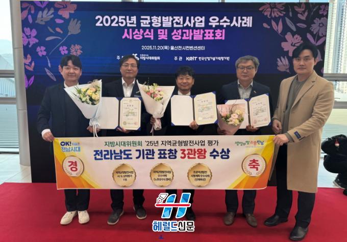 [Çì·²µå½Å¹® = ³ë½Â¾ð ±âÀÚ] Àü¶ó³²µµ´Â ´ëÅë·ÉÁ÷¼Ó Áö¹æ½Ã´ëÀ§¿øÈ¸¿¡¼ ÁÖÃÖÇÏ´Â 2025³â ±ÕÇü¹ßÀü»ç¾÷ ¿ì¼ö»ç·Ê ½Ã»ó½Ä¿¡¼ Àü±¹¿¡¼ À¯ÀÏÇÏ°Ô 3°³ ºÎ¹®À» ¸ðµÎ ¼ö»óÇß´Ù°í ¹àÇû´Ù.