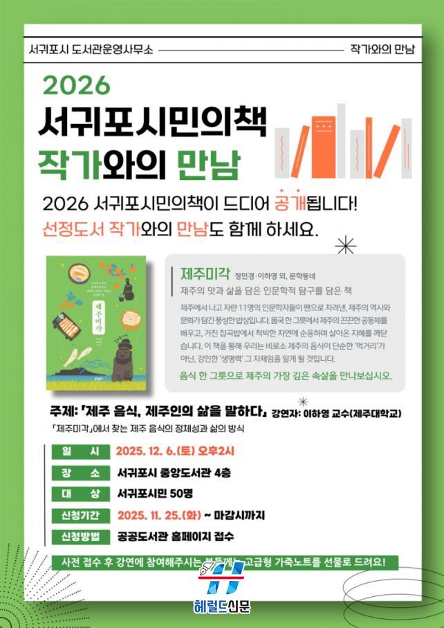 2026 ½Ã¹ÎÀÇ Ã¥ ¼±Á¤ µµ¼ Áß ¡¸Á¦Áֹ̰¢¡¹Àº Á¦ÁÖ À½½Ä ¼Ó¿¡ Á¦ÁÖÀÎÀÇ ¿ª»ç¡¤»ýȰ¡¤Á¤¼°¡ ¾î¶»°Ô ÃàÀûµÇ¾î ¿Ô´ÂÁö¸¦ ´Ù·ç¸ç, ÀÛ°¡ÀÇ °¿¬À» ÅëÇØ Á¦ÁÖ °íÀ¯ÀÇ ¹Ì°¢°ú »îÀ» ÀçÁ¶¸íÇÏ´Â ÀÇ¹Ì ÀÖ´Â ½Ã°£ÀÌ µÉ Àü¸ÁÀÌ´Ù.