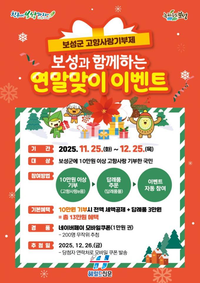 º¸¼º±ºÀº À̺¥Æ® ±â°£ ³» ±âºÎÀÚ Áß ÃÑ 200¸íÀ» ¹«ÀÛÀ§ ÃßÃ·ÇØ ¡®³×À̹öÆäÀÌ 1¸¸ ¿ø ¸ð¹ÙÀÏ ÄíÆù¡¯À» Á¦°øÇÑ´Ù. Ãß÷Àº 12¿ù 26ÀÏ¿¡ ÁøÇàµÇ¸ç, ´ç÷ÀÚ´Â ¹®ÀÚ ¸Þ½ÃÁö¸¦ ÅëÇØ °³º° ¾È³»µÈ´Ù. À̺¥Æ®¸¦ ÅëÇØ °íÇâ»ç¶û±âºÎÁ¦ Âü¿© È®´ë´Â ¹°·Ð, Áö¿ª ³ó¡¤Æ¯»ê¹° ¼Òºñ ÃËÁø°ú º¸¼º±º ºê·£µå °¡Ä¡ Á¦°í¿¡µµ ±àÁ¤ÀûÀÎ È¿°ú¸¦ °¡Á®¿Ã °ÍÀ¸·Î ±â´ëÇÑ´Ù.