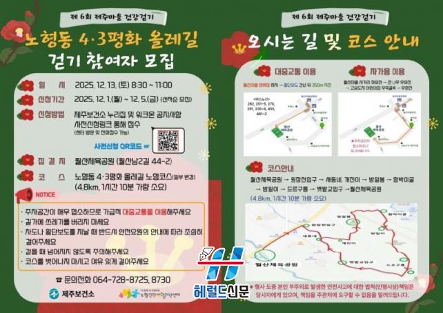 [Çì·²µå½Å¹® = ³ë½Â¾ð ±âÀÚ] Á¦ÁÖº¸°Ç¼Ò ³ëÇü°Ç°»ýȰÁö¿ø¼¾ÅÍ´Â µµ¹Î°ú °ü±¤°´ÀÌ ÇÔ²²ÇÏ´Â ¡®Á¦ÁÖ¸¶À» °Ç°°È±â Åõ¾î-³ëÇüµ¿ 4¡¤3ÆòÈ ¿Ã·¹±æ¡¯ Çà»ç Âü°¡ÀÚ 250¸íÀ» ¼±Âø¼ø ¸ðÁýÇÑ´Ù.
