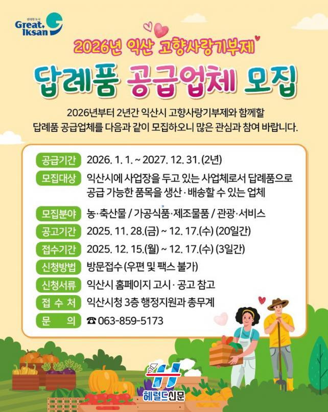 ÀÍ»ê½Ã´Â 2026~2027³â °íÇâ»ç¶û±âºÎÁ¦ ´ä·ÊǰÀ» °ø±ÞÇÒ Áö¿ª ¾÷ü¸¦ ¿À´Â 15~17ÀÏ °ø°³ ¸ðÁýÇÑ´Ù.