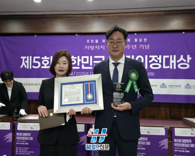 [Çì·²µå½Å¹® = ³ë½Â¾ð ±âÀÚ] ³ª±¤±¹ Àü³²µµÀÇ¿ø(¹«¾È2¡¤´õºÒ¾î¹ÎÁÖ´ç)ÀÌ Áö³ 11¿ù28ÀÏ ¼¿ïƯº°½Ã ±¹È¸µµ¼°ü¿¡¼ ¿¸° Á¦5ȸ ´ëÇѹα¹ À§¹ÎÀÇÁ¤´ë»óÀ» ¼ö»óÇß´Ù.