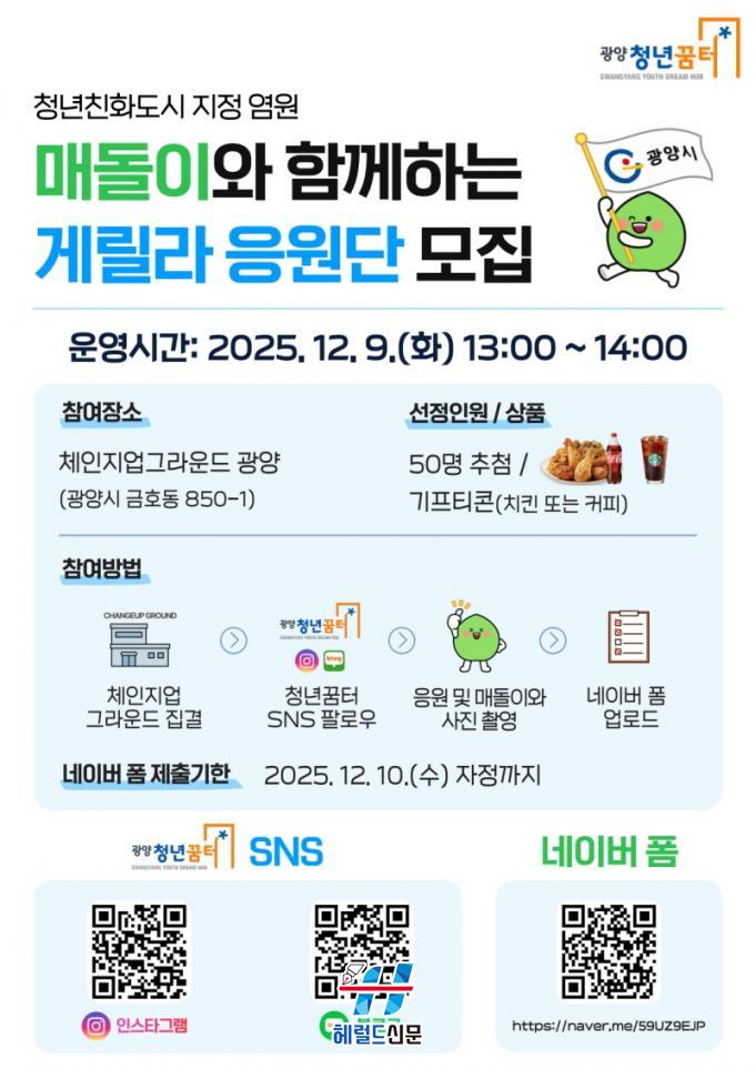 Âü¿©¸¦ Èñ¸ÁÇÏ´Â ½Ã¹ÎÀº Çà»ç ´çÀÏ Ã¼ÀÎÁö¾÷±×¶ó¿îµå ±¤¾ç¿¡¼ °Ô¸±¶ó ÀÀ¿ø¿¡ Âü¿©ÇÑ ÈÄ ¸Åµ¹ÀÌ¿Í ÀÎÁõ»çÁøÀ» ÃÔ¿µÇÏ¸é µÈ´Ù. ÀÌÈÄ Ã»³â²ÞÅÍ °ø½Ä SNS °èÁ¤À» ÆÈ·Î¿ìÇϰí ÀÎÁõ»çÁøÀ» 12¿ù 10ÀϱîÁö ³×À̹ö Æû¿¡ ¾÷·ÎµåÇϸé Âü¿©°¡ ¿Ï·áµÈ´Ù. ¸ðµç ÀýÂ÷¸¦ ¿Ï·áÇÑ Âü¿©ÀÚ Áß ÃÑ 50¸íÀ» ÃßÃ·ÇØ ġŲ ¶Ç´Â Ä¿ÇÇ ±âÇÁƼÄÜÀ» Á¦°øÇÒ ¿¹Á¤ÀÌ´Ù.
