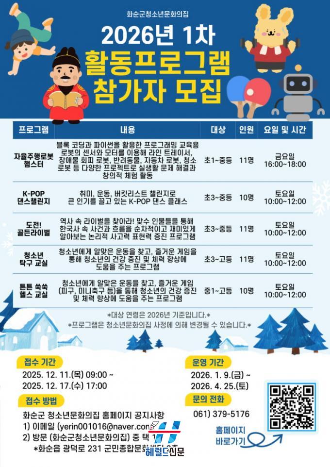 [Çì·²µå½Å¹® = ³ë½Â¾ð ±âÀÚ] ȼø±º(±º¼ö ±¸º¹±Ô)Àº ¿À´Â 12¿ù 11ÀϺÎÅÍ 12¿ù 17ÀϱîÁö û¼Ò³â¹®ÈÀÇÁý¿¡¼ '2026³â 1Â÷ Ȱµ¿ÇÁ·Î±×·¥ Âü°¡ û¼Ò³â 53¸íÀ» ¸ðÁýÇÑ´Ù°í ¹àÇû´Ù.