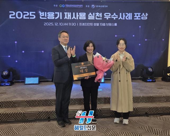 ÀüÁֽô ¿ÃÇØ ÀÚ¿ø¼øÈ¯º¸Áõ±Ý°ü¸®¼¾ÅͰ¡ ÁÖ°üÇÑ ¡®2025³âµµ Á¦3ȸ ºó¿ë±â Àç»ç¿ë ½Çõ ¿ì¼ö»ç·Ê Æò°¡¡¯¿¡¼ ÁöÀÚü ºÎ¹® ¡®´ë»ó¡¯¿¡ ¼±Á¤µÆ´Ù°í 11ÀÏ ¹àÇû´Ù. ½Ã»ó½ÄÀº Áö³ 10ÀÏ ¼¿ï ÇÁ·¹Áö´øÆ®È£ÅÚ¿¡¼ ¿·ÈÀ¸¸ç, ½Ã´Â ´ë»ó ¼ö»ó°ú ÇÔ²² 500¸¸ ¿øÀÇ Æ÷»ó±ÝÀ» ¹Þ¾Ò´Ù.
