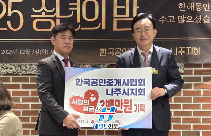 [Çì·²µå½Å¹® = ³ë½Â¾ð ±âÀÚ] Çѱ¹°øÀÎÁß°³»çÇùȸ ³ªÁÖ½ÃÁöȸ(ȸÀå Á¶±âÁØ)´Â Áö³ 9ÀÏ ¼Û³âȸ Çà»ç¿¡¼ °ü³» ¾î·Á¿î ÀÌ¿ôÀ» µ½±â À§ÇØ È¸¿øµéÀÌ ½Ê½ÃÀÏ¹Ý ¸¶·ÃÇÑ ¼º±Ý 200¸¸ ¿øÀ» ³ªÁÖ½Ã(À±º´ÅÂ)¿¡ Àü´ÞÇß´Ù.