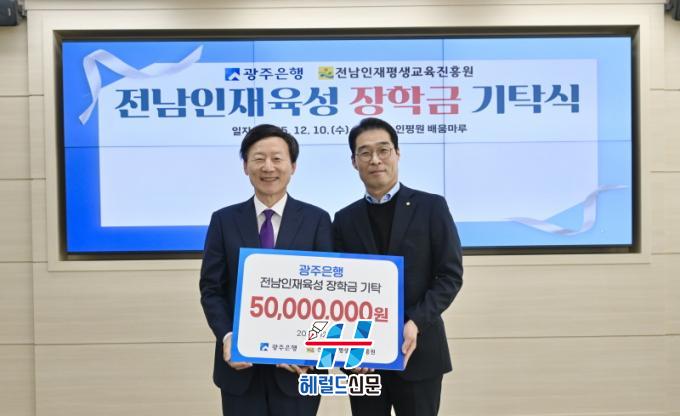 [Çì·²µå½Å¹® = ³ë½Â¾ð ±âÀÚ] Àü³²ÀÎÀçÆò»ý±³À°ÁøÈï¿øÀº ±¤ÁÖÀºÇàÀÌ Àü³²ÀÎÀçÀ°¼º ÀåÇÐ±Ý 5õ¸¸ ¿øÀ» Áö³ 10ÀÏ ±âÅ¹ÇØ Áö¿ª ¹Ì·¡ÀÎÀç ¾ç¼º¿¡ ÈûÀ» º¸ÅÉ´Ù°í ¹àÇû´Ù.