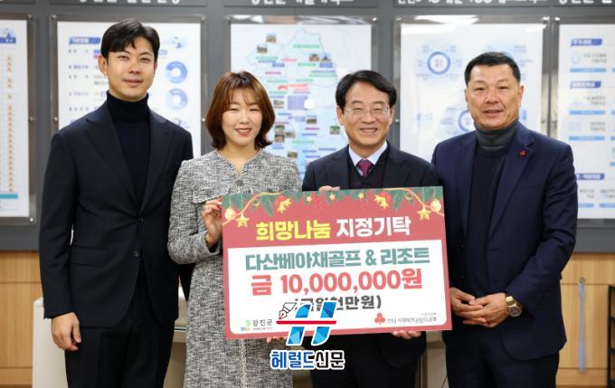 [Çì·²µå½Å¹® = Àü¿µ±Ô ±âÀÚ] ±èÀ¯¸² ´Ù»êº£¾ÆÃ¤ °ñÇÁ¾Ø¸®Á¶Æ®ÀÇ ÃѰý»çÀå°ú À庸¼º ´ëÇ¥, ±èÈï±æ »çÀåÀÌ ¿¬¸»À» ¸Â¾Æ Áö³ 11ÀÏ 'Èñ¸Á2026 ³ª´®Ä·ÆäÀÎ ÀÌ¿ôµ½ ±â' ¼º±Ý 1,000¸¸ ¿øÀ» °Áø±º¿¡ ±âŹÇß´Ù. À̵éÀº Áö³ 2019³âºÎÅÍ ¿ÃÇØ±îÁö 'Èñ¸Á³ª´®Ä·ÆäÀÎ'À» ÅëÇØ ¸Å³â 1,000¸¸ ¿øÀÇ ÀÌ¿ôµ½±â ¼º±Ý, 2023³â üÀ° ²Þ³ª¹« À°¼ºÀ» À§ÇØ °Áø±º üÀ°È¸¿¡ 1,000¸¸ ¿øÀ» ±âºÎÇÏ´Â µî ²ÙÁØÈ÷ »çȸ°øÇå Ȱµ¿À» ÇØ¿À°í ÀÖ´Ù.