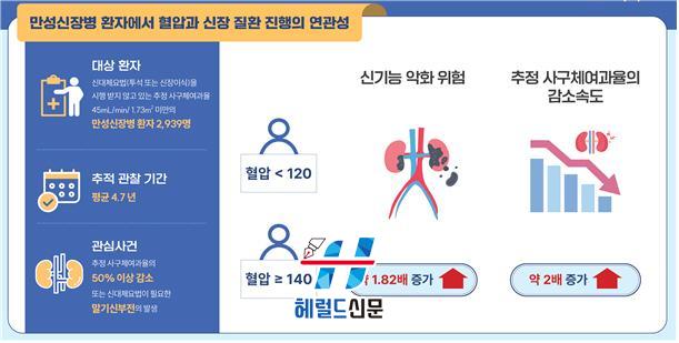 ¿¬±¸ °á°ú, ¼öÃà±â Ç÷¾ÐÀÌ 140mmHg ÀÌ»óÀΠȯÀÚ´Â 120mmHg ¹Ì¸¸ÀΠȯÀÚ ´ëºñ ½ÅÀå ±â´É ¾ÇÈ À§ÇèÀÌ ¾à 1.82¹è·Î ³ô¾Ò°í, ¾à 5³â°£ ÃßÀû °üÂûÇÑ °á°ú ½ÅÀå±â´É °¨¼Ò ¼Óµµµµ ¾à 2¹è »¡¶ú´Ù.